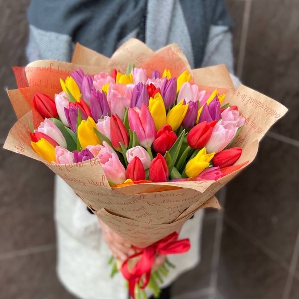 Тюльпан микс 51 штука - букет, который идеально оформлен, что подчеркивает естественную красоту всех бутонов