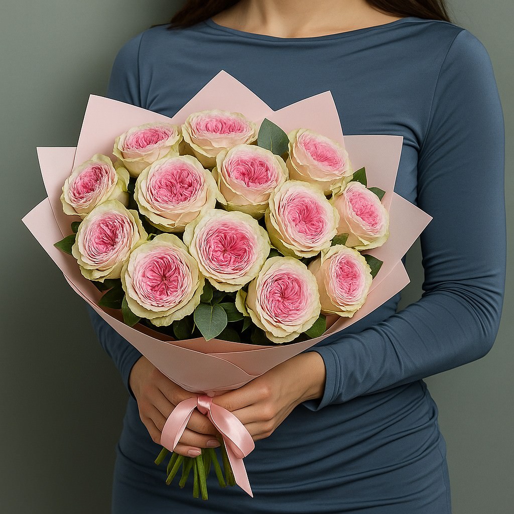 Роскошный букет пионовидных роз с яркой розовой серединкой и нежными белыми краями лепестков. Такой контрастный микс смотрится стильно и элегантно, подчёркивая свежесть и естественную красоту цветов. Идеален для подарка на день рождения, годовщину или просто для того, чтобы порадовать близкого человека.