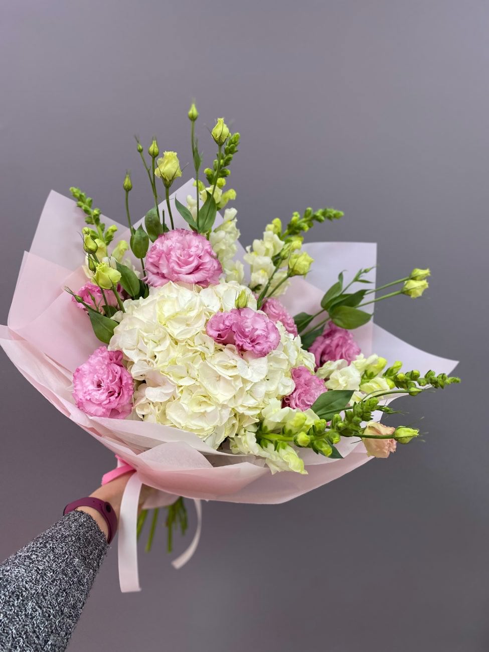 Этот букет выглядит как праздник! Необычное сочетание пушистой гортензии, строгой эустомы и очаровательного львиного зева создано, чтобы производить впечатление и дарить радость.