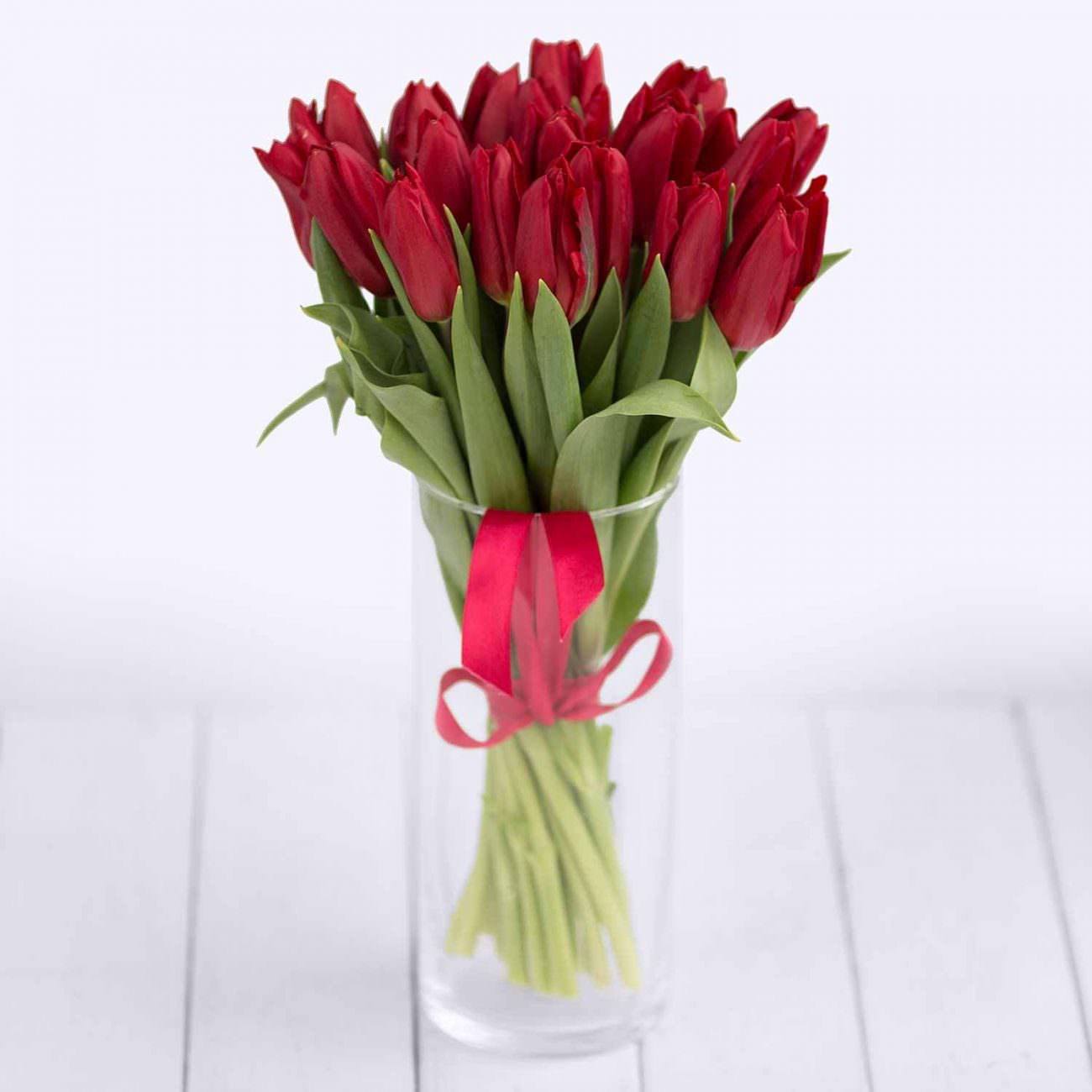 Букет красных тюльпанов под ленту — 15 штук
