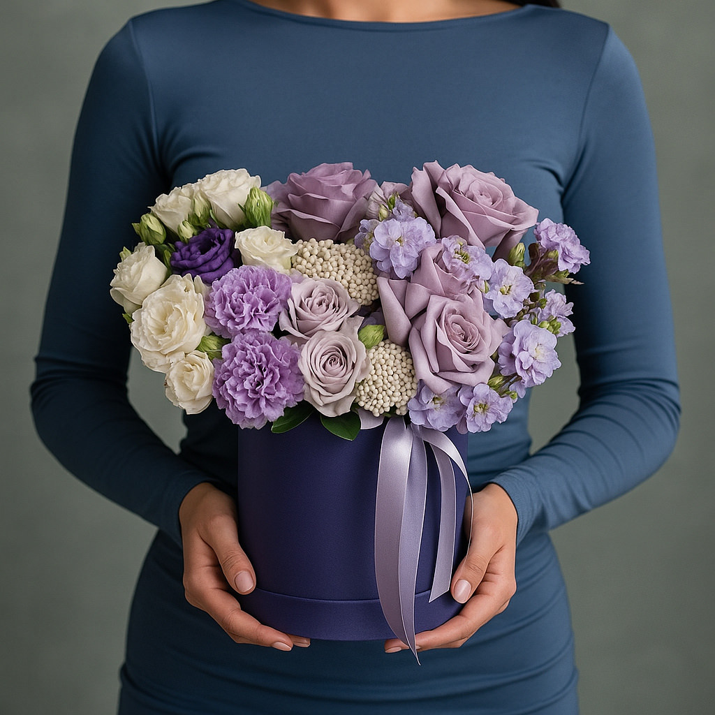 Элегантная композиция из нежных роз и гвоздик в фиолетовой гамме. Символ утончённости и душевного тепла.